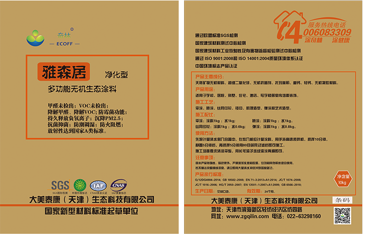 雅森居-凈化型:無機(jī)多功能生態(tài)涂料1.甲醛未檢出;VOC未檢出;2.抗菌抑菌;防霉菌功能;3.防潮調(diào)濕;消除室內(nèi)異味;4.防火阻燃;5.放射性達(dá)到A類標(biāo)準(zhǔn);6.持久釋放負(fù)氧離子;沉降PM2.5;7.降解甲醛、降解VOC。凈含量:10kg工藝性能:平涂、噴涂、彈涂、輥涂,各種肌理造型,絲網(wǎng)印樓印技術(shù);有千余種顏色搭配,并且涂刷效果可以多彩多圖個(gè)性定制,美觀大方,采用無機(jī)色漿,顏色色澤持久穩(wěn)定。